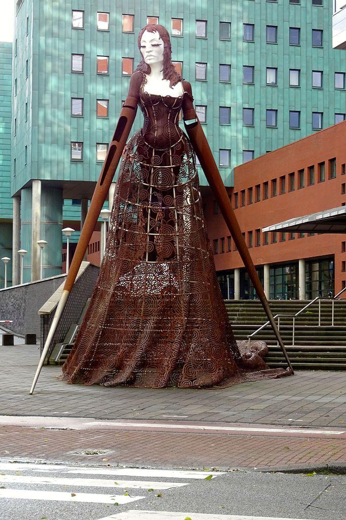 Les pommettes hautes, le tas plein de cheveux et la hauteur impressionnante de cette dame vous font émerveiller de sa beauté à première vue. Mais regardez mieux et vous verrez des proportions qui ne semblent pas complètement correctes. En raison de la robe transparente, vous pouvez voir ses jambes courtes pendantes. Elle ne rencontre pas l'idéal de beauté habituel des longues jambes et se tient donc avec des prothèses de bras. Cette image particulière est inspirée par les développements scientifiques actuels, qui contribuent à la création de l'homme.