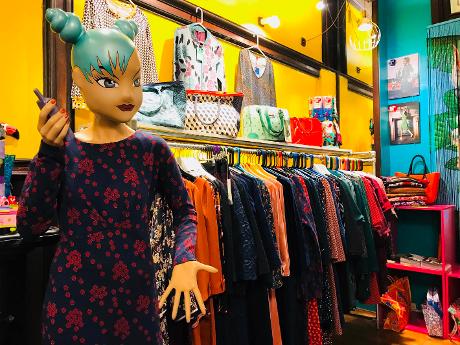 Petit mais frappant magasin de vêtements vintage avec beaucoup de vêtements et d'accessoires pour 1980.